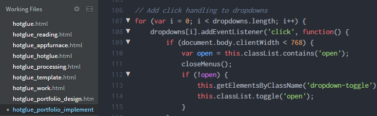 In Portfolio Design Exercise I explain that I've decided that my design would have a certain scope and features. However, the technologies chosen had to be adapted for the website to work properly. In order to do this, I've added a few scripts (in JavaScript) to make sure the content would respond to a wide range of screen resolutions, and although most of this is handled by Bootstrap some corrections had to be made. It's very clear that HOTGLUE as it's purpose and it's not for intensive web development.